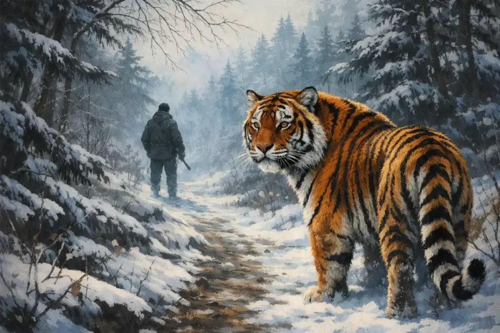 Две недели я прожил на кордоне и каждый день уходил на лыжах в тайгу. Нет следов. И вот, уже собираясь в Гвасюги вместе с охотниками, решившими встретить Новый год с семьями, я решил напоследок сходить в тайгу. Уже темнело, и вдруг я краем глаза заметил какую-то тень. Присел. И через секунду на меня вышел тигр!