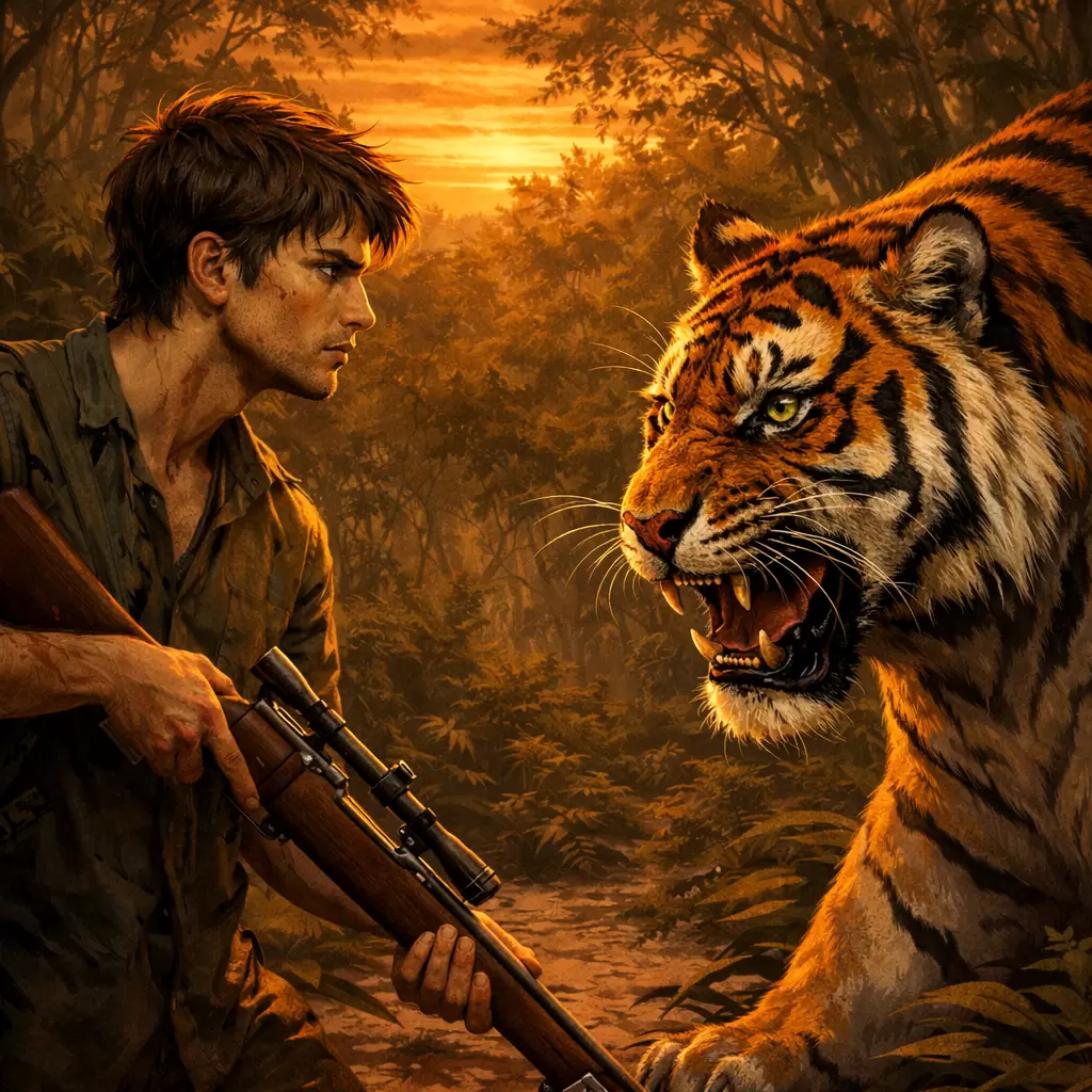 Топнув ногой с досады, юноша взбежал на гребень холма. Тигра нигде не было. Молодой человек полез за патронами, но патронташ оказался пуст. Позади зашелестел кустарник. Юноша быстро обернулся. Перед ним, метрах в пяти, стоял тигр и смотрел ему прямо в глаза. Юноша медленно выпустил ружье, но продолжал стоять, глядя на тигра. Он знал, что это его последние секунды.
