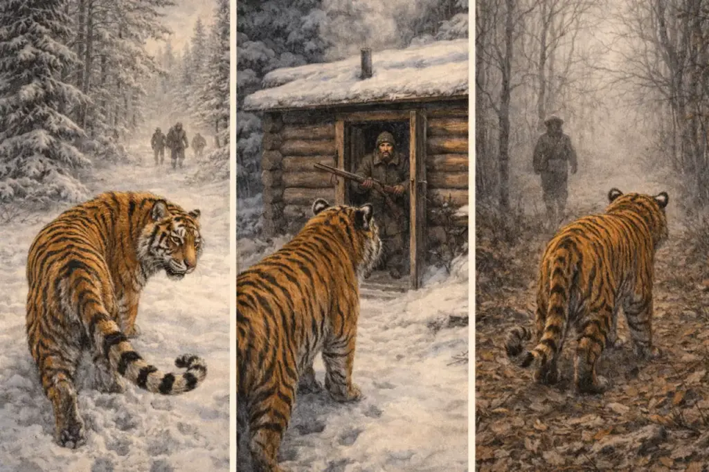 Зверь заметил испуг в глазах двуногого, но это его не удивило. Он уже видел страх на лицах людей, которых встречал в лесу. Он продолжал наблюдать, ему было интересно, он не питал ни малейшего недоброжелательства к этому человеку. А тот, едва скрывшись в избе, сильно и плотно захлопнул дверь. И этот хлопок двери вдруг встревожил тигра. Внезапно он вспомнил, что люди, после того как исчезнут с его глаз, громыхают в него своими ружьями. И тотчас стремительными длинными прыжками бросился вглубь тайги. Всего две секунды потребовалось ему, чтобы исчезнуть, раствориться в глубокой спасительной таёжной густоте. И, подтверждая его догадку, его звериную памятливость, вслед ему загрохотали запоздалые выстрелы.