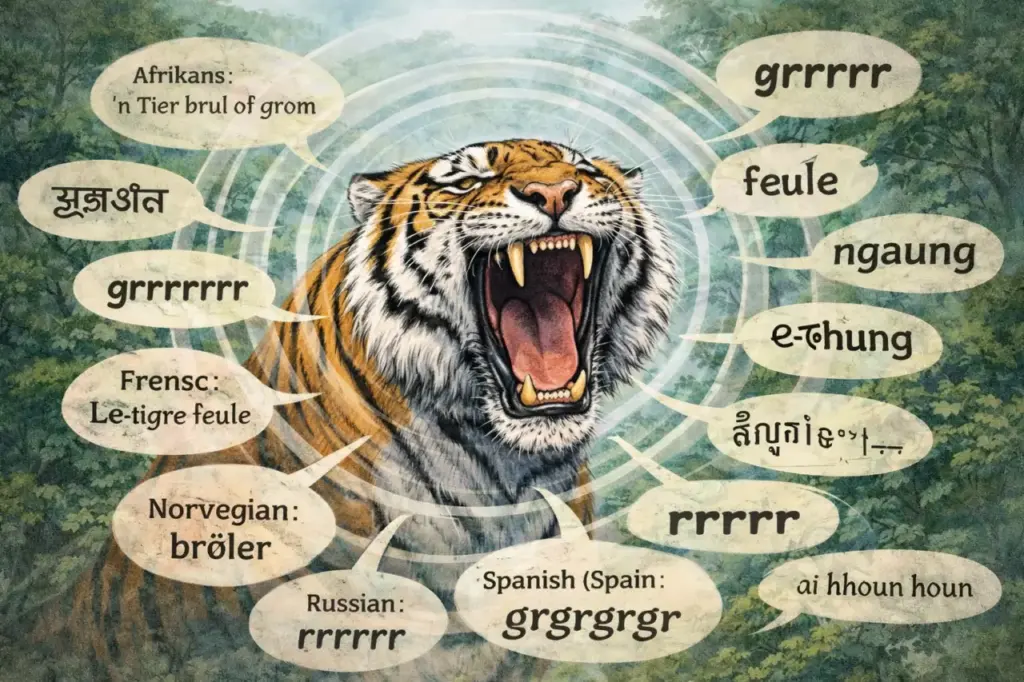 Afrikaans: ‘n Tier brul of grom.