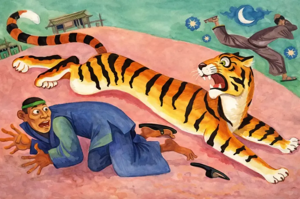 Дошел вор до места, где притаился тигр, увидел, что кто-то сидит около стены — а это был тигр, — и принял тигра за своего товарища.