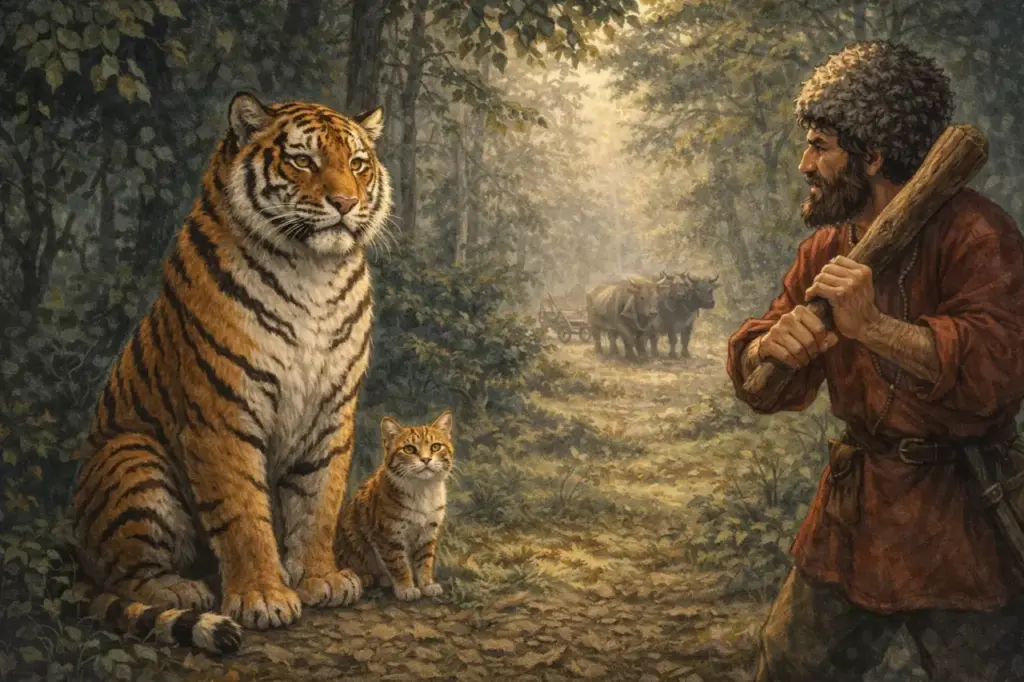 На окраине села крестьянин пахал землю. Из дому вместе с рабочим скотом прибежал и кот, и в самый разгар пахоты гонялся он на опушке леса за бабочками и кузнечиками. В это время по лесу бежал тигр. Очень удивился тигр, завидя кошку, и спрашивает: