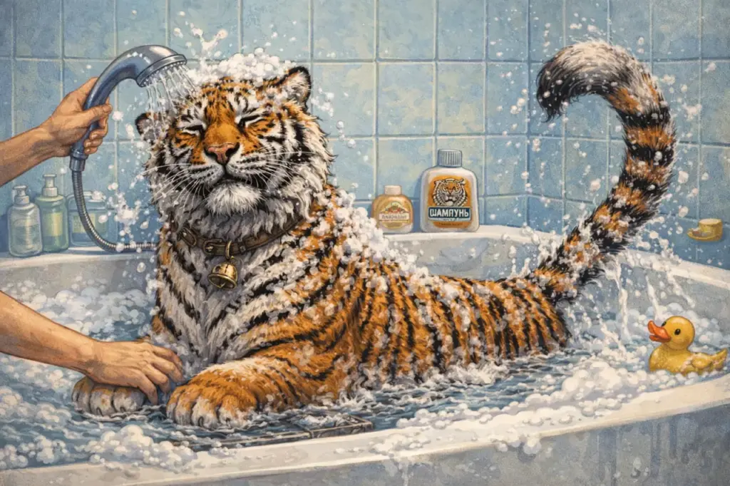 Самая лучшая температура воды для мытья Тигров — +39 — + 40 градусов. При этой температуре Тигра расслабляется, тихо сидит на дне бассейна или ванны, иногда выгибает спинку (если это хороший Тигра) и тихонько машет мягким хвостом.