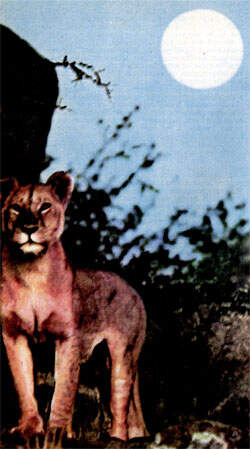 Днем лев-самец предпочитает спать в тени. Он вял и бездеятелен. Только ночью полностью проявляется его львиный характер. Ночью лев в своей стихии. Он гордо шествует по своим владениям, и в лунном свете играют его мускулы, а рыжеватая шкура отливает серебром. Первозданная тишина саванны внезапно оглашается громоподобным ревом, долго не затихающим над потрясенной и поверженной землей.