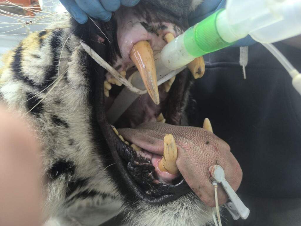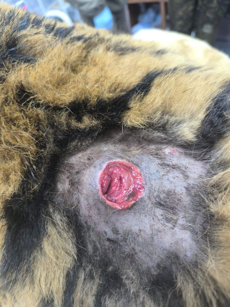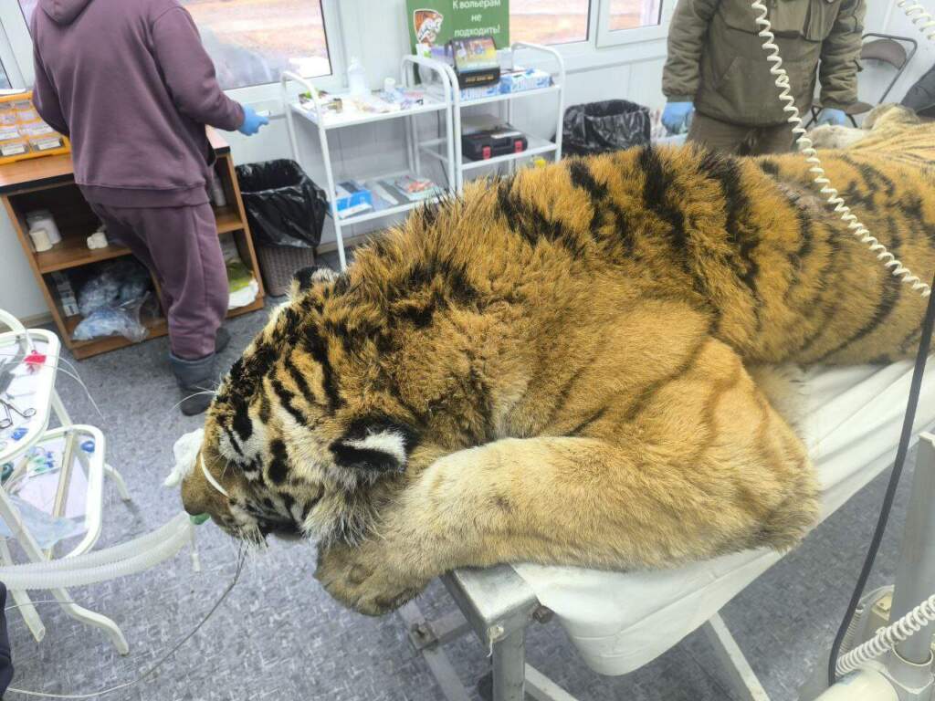 Вчера в наш Центр был доставлен амурский тигр, напавший на человека в Чугуевском районе Приморского края. В ходе ветеринарного осмотра у тигра обнаружено сквозное огнестрельное ранение (что подтверждено анализом ранения) в районе холки. Входное отверстие уже зарубцевалось, на выходе наблюдается осложнение (воспаление мягких тканей). В ходе анализа имеющихся материалов установлено, что именно этот тигр напал на человека. На месте трагедии обнаружена пластиковая бутылка, прокушенная тигром. По прокусам видно, что у тигра сломаны клыки: левый верхний и правый нижний. При осмотре это подтвердилось. Также был проведен сравнительный анализ фотоматериалов, имеющихся у Госохотнадзора, и уникального рисунка на шкуре изъятого тигра. В итоге установлено, что именно этот тигр напал на человека в Чугуевском районе Приморского края. В настоящее время ожидаем решение Росприроднадзора о месте для постоянного содержания этого тигра.