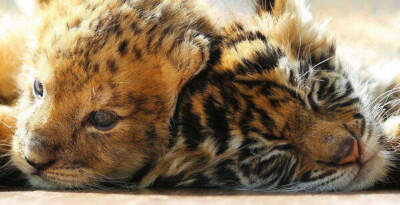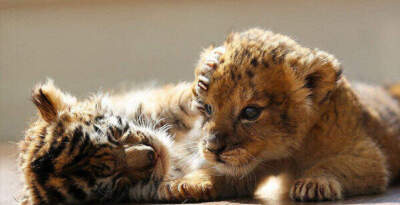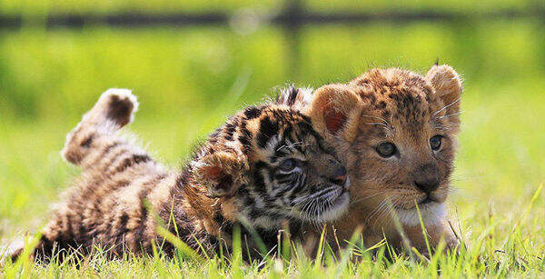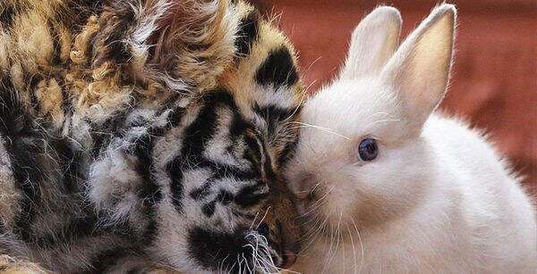 Маленькие тигренок и львенок на фотографиях обнимаются и играют, имитируя сражение, так, словно они родные братья. Похоже, их совершенно не волнует принадлежность к различным видам. А судя по фотографиям, где они мирно общаются с кроликами, хищнические инстинкты в малышах тоже еще не проснулись.