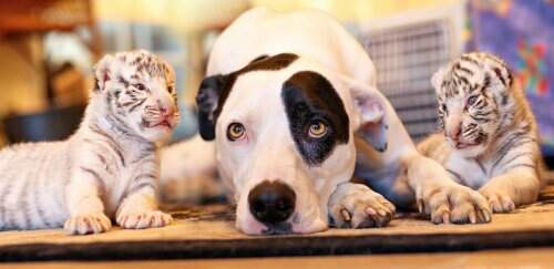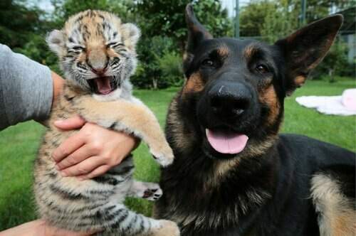 По словам хозяйки собаки, несколькими годами ранее пес Леон точно так же пригрел и белого львёнка, от которого отказалась мать. Пёс по…