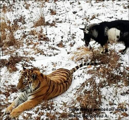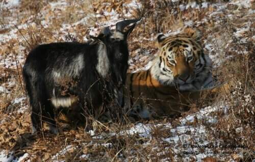 В Приморском сафари-парке в Шкотовском районе Приморья тигр Амур подружился с козлом, которого ему прислали на съедение. Сотрудники парка назвали козла Тимуром…