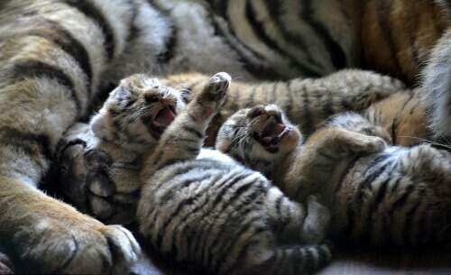 Зоопарк китайского города Шэньян выложил первые фотографии четырех тигрят, которые родились неделю назад.