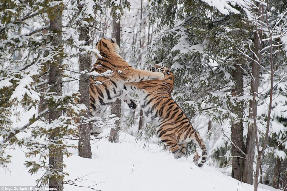 Немецкому фотографу дикой природы Инго Герлаху (Ingo Gerlach) удалось запечатлеть двух самцов амурского тигра, которые сошлись в схватке в заснеженном лесу заповедника Орса Бьёрн (Orsa-Björn Wildlife Park), что в Швеции.